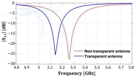 Comparison between the return losses of the compared antennas (non-transparent and transparent).