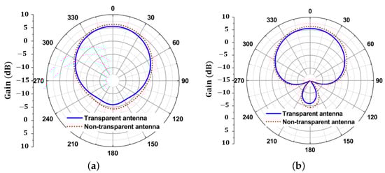 The radiation patterns for the two antennas are also compared in Figure 9. These diagrams are obtained for the resonance frequencies of each antenna and for the two planes: the XZ-plane (Figure 9a) and YZ-plane (Figure 9b). These results are in acceptable agreement because the antennas’ sizes are equivalent. The maximum gains were dBi and dBi for the non-transparent and transparent antennas, respectively. Both antennas achieved good gain in the operating band for WLAN applications. Therefore, increasing the resistance value of the sheet deteriorated the gain of the mesh antenna. This can be compensated by using meta-materials and applying array antenna techniques [].