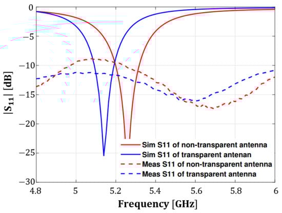 The simulated and measured reflection coefficient of the non-transparent and transparent antennas are shown in Figure 11. The impedance matching of the manufactured transparent antenna was not well matched; this may be justified among other things by the process inaccuracies in the manufacturing of the mesh antenna, the electrical losses of the glass substrate, and the increase in the resistance value of the sheet through the use of the mesh technique. Additionally, the metal thickness was so thin that it was comparable to the skin depth value of (calculated using the skin depth equation []); high loss was present, which reduced the performance of the antenna.