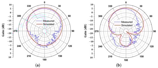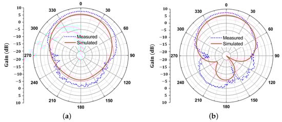 The far-field radiation patterns of the non-transparent antenna at are shown in Figure 12. Figure 13 shows the far-field radiation patterns of the transparent antenna at . In general, the simulated results matched the measured results. The observed deviations were attributed to the manufacturing problems and losses related to the electrical characteristics of the substrate. It was also observed that the antenna had an essentially unidirectional radiation pattern. The measured back radiation could not be evaluated due to the measurement configuration of the anechoic chamber.