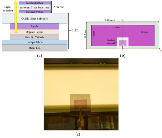 Antenna integration into the OLED structure; (a) cross-sectional view, (b) top view, and (c) in the measurement step.