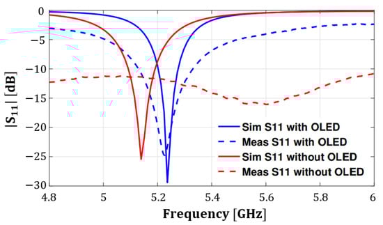 The comparison between the measured and simulated reflection coefficient of the antenna with and without the OLED is shown in Figure 15. From this figure, it can be observed that an acceptable agreement between the results was obtained and the bandwidth can well cover the desired WLAN frequency band. The transparent antenna return loss is affected by the OLED. The layers of the OLED also affect the antenna impedance, and it is less adapted at . The resonance frequency of the proposed antenna shifts to low frequencies with a narrow bandwidth.