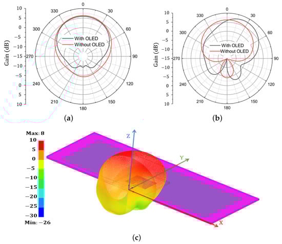 Radiation patterns of the transparent antenna with and without OLED; (a) in the XZ-plane, (b) in the YZ-plane, and (c) with OLED in 3D view.
