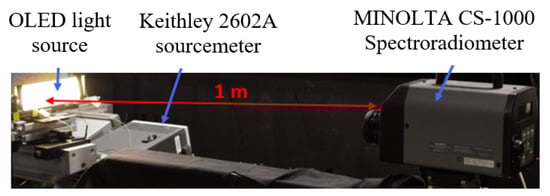 After the study of the effects of the OLED on the radio-electrical parameters of the antenna, it is very important to investigate the influence of this integration on the color appearance of the OLED. Therefore, the optical and photometric characterizations of the OLED were carried out before and after the antenna integration. Figure 17 shows a photograph of the optical and photonic measurements of the OLED. These measurements were carried out on an optical bench at room temperature with the MINOLTA CS-1000 spectroradiometer. This measuring device was placed 1 from the OLED, allowing the measurement of the optical and colorimetric parameters in the visible field (380–780 nm) in steps []. The measurements were carried out in both with and without the antenna and were repeated 21 times to ensure the accuracy of the measured values.