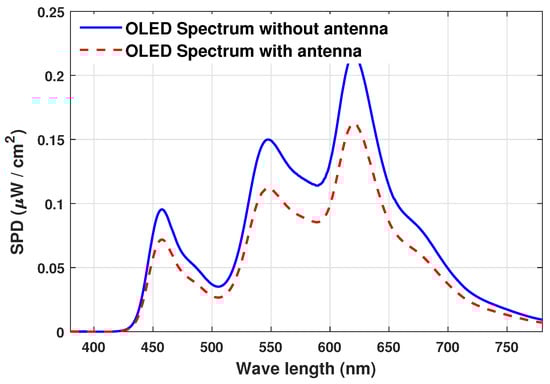 Figure 18 illustrates a comparison between the SPD of a warm white OLED (CCT = 3000 ) and the SPD of the OLED measured with the integrated antenna. It was noticed that the SPD changed after the integration of the antenna. A variation in the SPD generally results in changes in the colorimetric parameters.