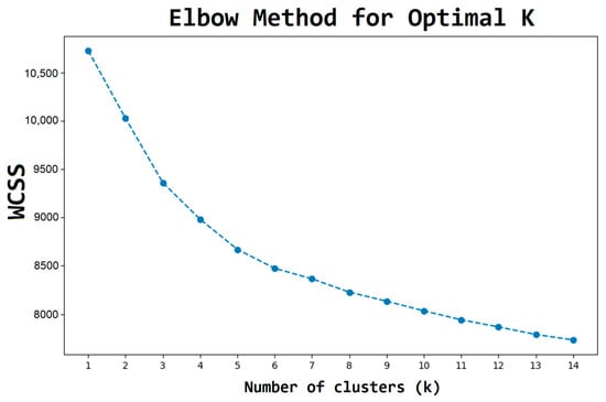To determine the optimal number of clusters (k), the authors used the elbow method by plotting the within-cluster sum of squares (WCSSs) against a range of k values to identify the point of inflection []. The elbow method is a heuristic used in determining the number of clusters in a dataset. A heuristic approach can be used if the applicable k value range is not big [].