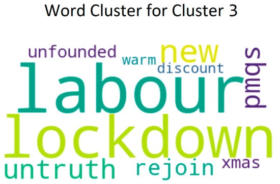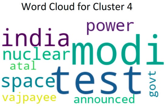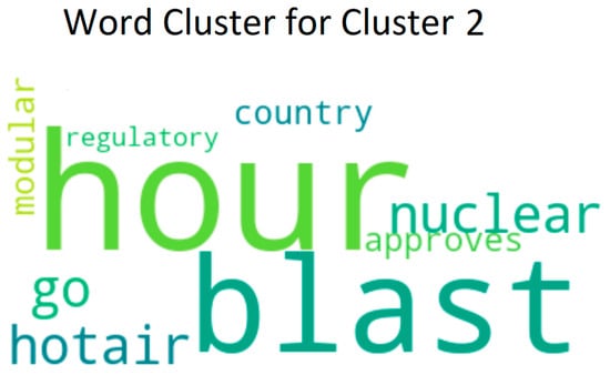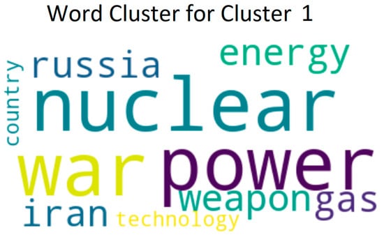 Each cluster is visualized with a word cloud that depicts the most important words as cloud-shaped collections of words with different sizes, colors, and orientations []. To increase the readability of each word cloud, only the 10 most important words were displayed for each cluster. The importance of each word is measured by its frequency of appearance in the cluster, and it is reflected in the different size of the words in the word cloud in order to make important words more visible than others.