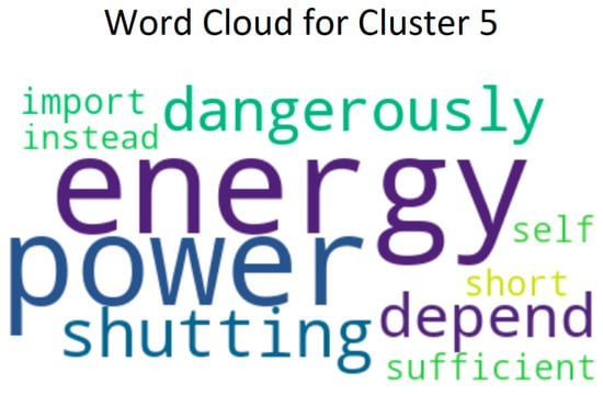 - Cluster 5—Mild Concerns Over Energy Dependence: Lastly, the mildly negative sentiment (neg: 0.27, compound: −0.2263) in the fifth cluster indicates concerns about energy security and dependence, resonating with those skeptical about the reliability and safety of nuclear energy.