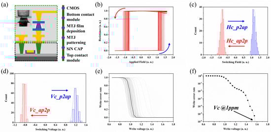 In our MRAM array, the MTJ cell was inserted between two metal lines in the back-end-of-line (BEOL) process as shown in Figure 2a. A brief flow of processes such as photolithography, etching, chemical mechanical polishing, etc., is shown in Figure 2a. Voltages were applied across the MTJ cell to obtain various electrical properties, such as resistance state, critical switching voltage, and so on. The R-H curves of 180 MTJ cells were measured at room temperature, and 15 cells were selected in Figure 2b for a clear look. The free layer switched its moment after the applied magnetic field exceeded its coercive field (HC) while the read voltage was continuously applied. There are similar sharp switching curves compared to MOKE curves, but the value of inline HC is significantly higher than that of offline HC due to its considerably smaller cell size, which lacks domain-wall assisted flipping. The distribution of HC extracted from 180 samples is shown in Figure 2c, where the HC switching either from AP state to P state or from P state to AP state shows perfect concentricity. When it came to electrical switching, the critical switching voltage was measured by gradually increasing the applied voltage with a pulse width of 20 ns. The switching voltage distribution for two directions (i.e., from AP mode to P mode and from P mode to AP mode) is shown in Figure 2d. Good uniformity is observed, and there is no obvious tail piece. Compared to the mean value of the switching voltage, about 35% overdrive is needed to achieve a satisfactory write-error rate according to the limited write times.