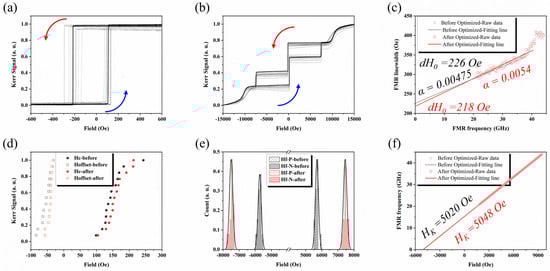 To further optimize the WER while maintaining chip performance, the non-magnetic layer in the SAF was chosen to improve the write-error rate without obviously changing the magnetic moment. The minor hysteresis loops and the major hysteresis loops tested by MOKE, after the insertion of a thin Pt layer between the seed layer and the SAF layer, are shown in Figure 3a,c. The magnetic anisotropy of Co/Pt multilayers is strongly influenced by the crystallographic orientation. The highest perpendicular magnetic anisotropy was observed in Co/Pt multilayers with Pt (111) aligned parallel to the film plane. Therefore, the inclusion of a Pt layer can enhance the perpendicular magnetic anisotropy of synthetic antiferromagnetic structures (SAFs) [,]. As can be seen, there are similar switching curves for similar MTJ stack structures. The HC in the film level, which refers to the stability of the free layer, keeps invariability (~150 Oe) for the fixed free layer. Similar performance is not only related to the mean value but also related to the distribution (see Figure 3b). After the change in the SAF, the Hex exhibited little change, while the Hf significantly improved from ~5700 Oe to ~7500 Oe, but the distribution remained unchanged. Visual comparisons before and after optimization are shown in Figure 3b,d. As discussed above, the HK and damping can change the phenomenon of WER. FMR spectrum measurements on the optimized MTJ stack were employed to verify the effect of SAF tuning on HK and damping. The dependence of the resonant field H on frequency f is shown in Figure 3e, and the extracted HK and damping compared to the baseline SAF are shown in Figure 3f. As can be seen, there are small differences in HK (5020 Oe vs. 5048 Oe) in the MTJ stacks before and after optimization. However, the fitted damping and ΔH0 exhibit little difference. The post stack exhibits greater damping (0.0054) and a smaller ΔH0 (218 Oe). A smaller ΔH0 indicates better uniformity, which is beneficial for less bifurcation switching in the WER test.