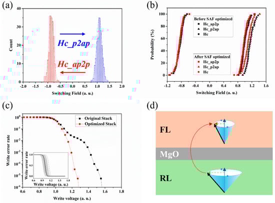 (a) The distribution of extracted Hc in patterned device level. (b) Comparison of Hc distribution before and after SAF optimization. (c) Comparison of the MTJ array write error before and after SAF optimization. (d) Schematic diagram of the SAF PMA influence on WER.