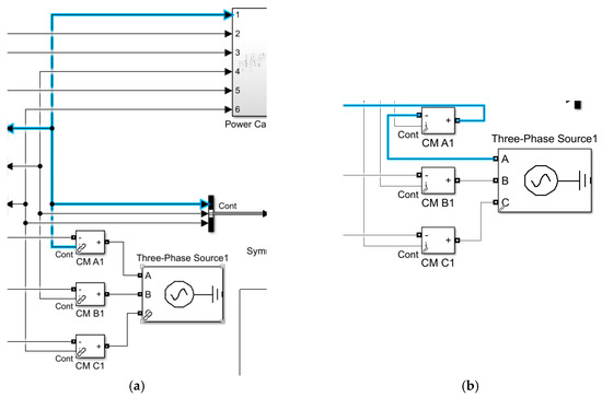 The model was reconfigured multiple times to accommodate the various fault scenarios described in Section 2. Some of the possible variants are shown in Figure 8. Figure 8a considers the power failure of phase A in the current network (the blue line will be disconnected). Figure 8b shows the polarity reversal in phase A of the current network. The case of the swapped current circuits A and B is shown in Figure 8c. In the voltage network, the polarity of all phases is reversed, while the polarity of the current remains correct, see Figure 8d.
