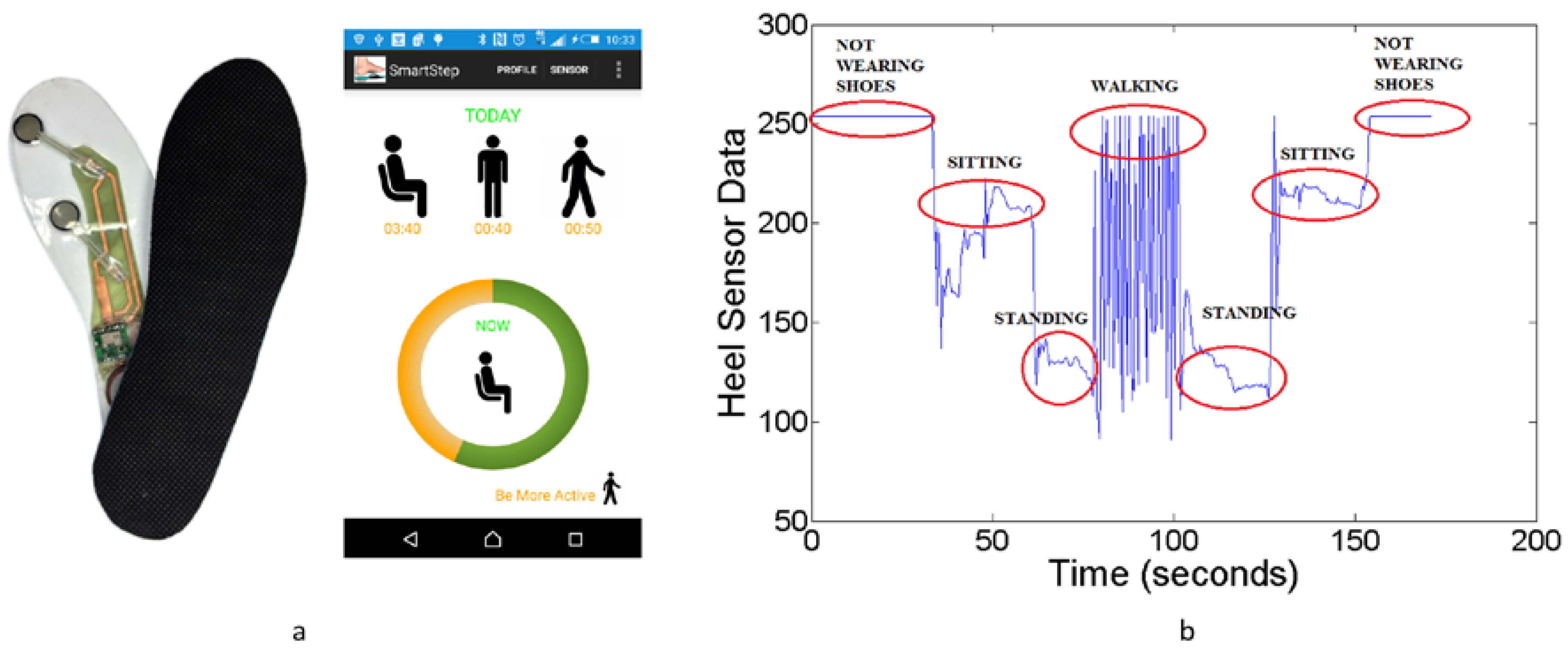 There are several footwear-based systems for posture and activity recognition purposes, and an example of these are the SmartShoe system developed by Sazonov et al. [72] which have been validated extensively for posture and activity monitoring. They have been used with healthy subject groups [30,72,73], people with stroke [55,74] and children with cerebral palsy [75]. The most recent incarnation of the SmartShoe systems, named SmartStep by Hegde et al., has shown the capability to be accurate in posture and activity classification [21,76,77]. Chen et al. have designed a foot-wearable interface for locomotion mode recognition based on contact force distribution [78]. Kawsar et al. have developed a novel activity detection system using plantar pressure sensors and a smartphone [79]. Table 3 contains the comparison of these systems. Figure 3a shows a picture of SmartStep insole [80] and the associated Android application for daily activity monitoring.