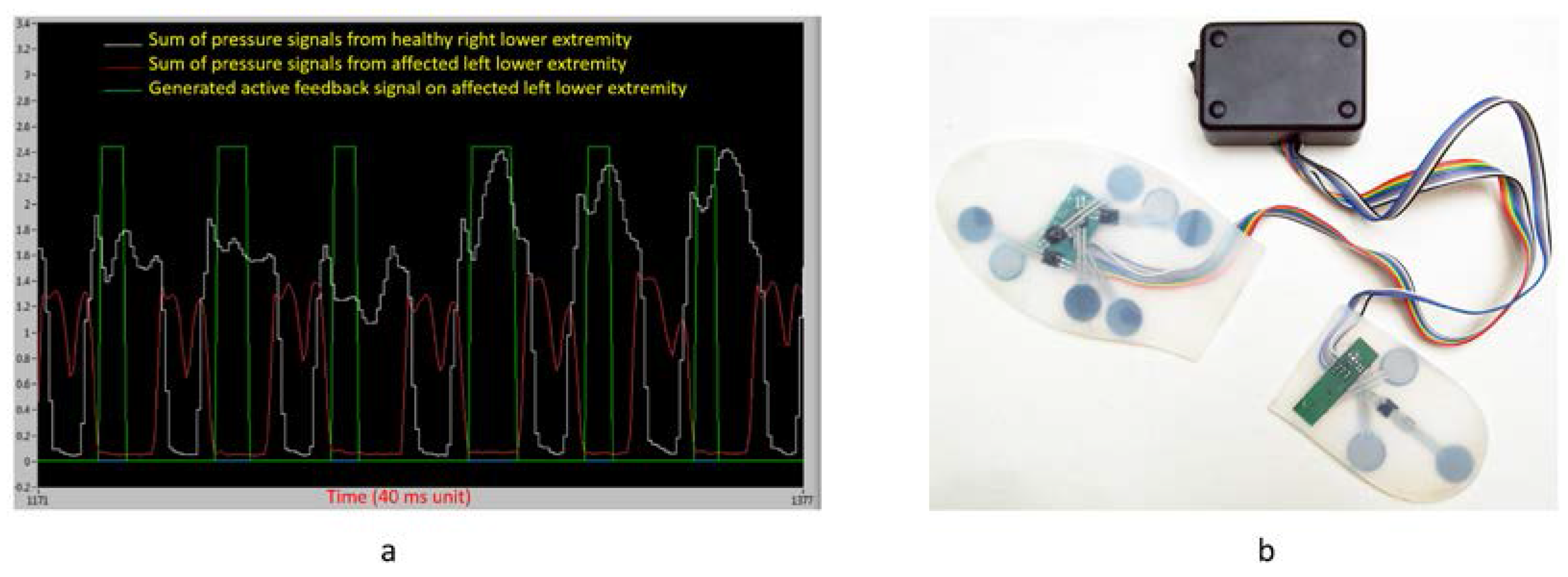 (a) Pressure sensor signals for asymmetric walking of a post-stroke subject and generation of active feedback [95]; and (b) biofeedback system presented by Bamberg et al. for stroke patients [96].