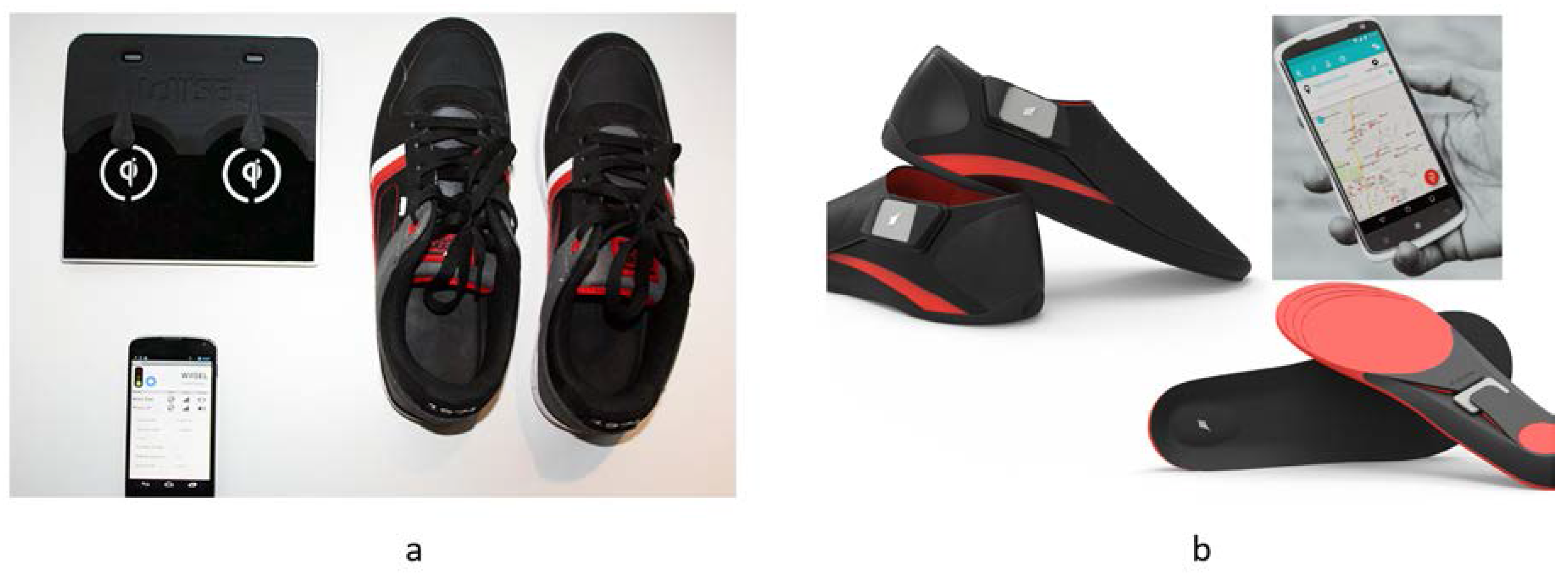 (a) Wiisel footwear system for fall risk application; and (b) Lechal system® for by Ducere Technologies Pvt. Ltd. (Secunderabad, Andhra Pradesh, India).