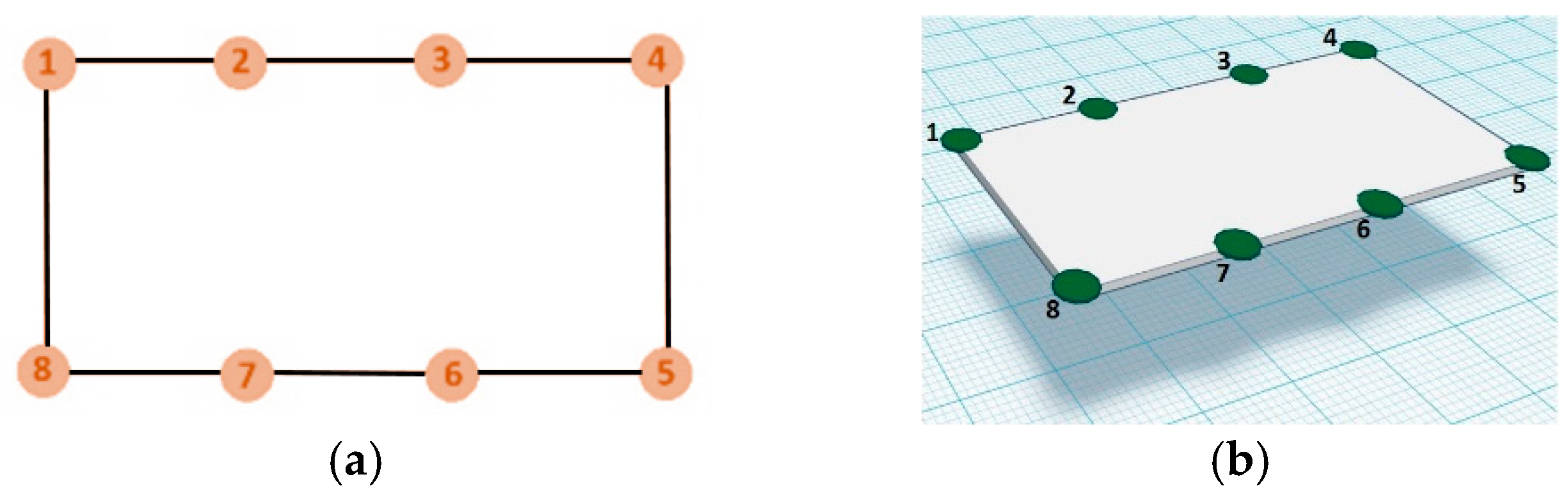 Registration point sets. (a) In orange the feature points extracted from the image; (b) In green the corresponding workspace coordinate frame points.
