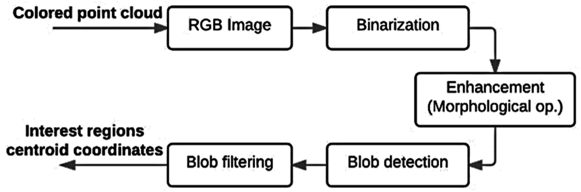 In our work, the input image is generated from the point cloud, so each pixel has a corresponding xyz coordinate. The thresholds are obtained locally by selecting a target region pixel to obtain its color component and a sensibility value chosen experimentally. The threshold of our image was defined by: