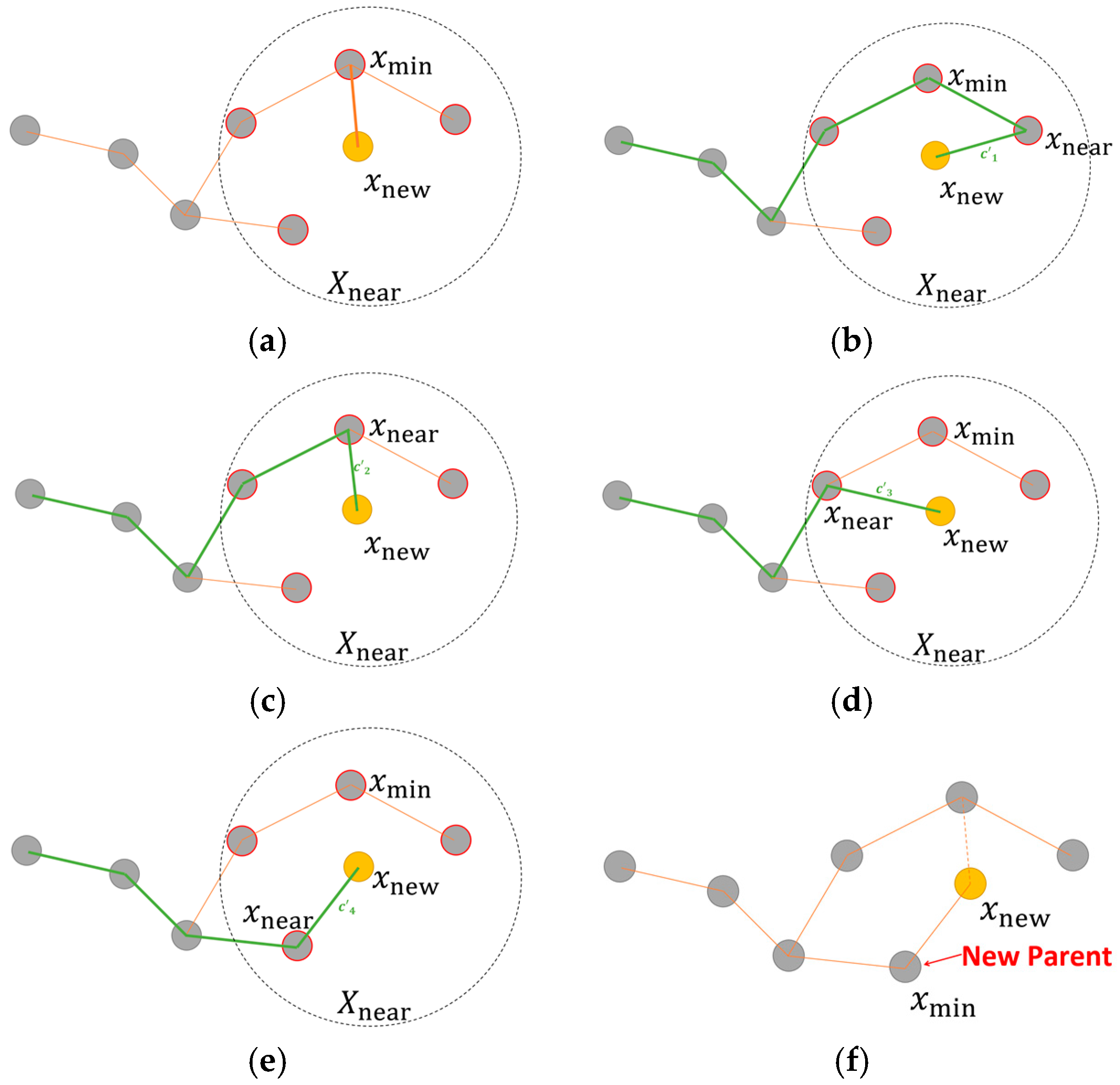 First optimization procedure of the Rapidly-exploring Random Trees variant (RRT*) algorithm. In gray the current tree vertices, in yellow the new vertex. (a) Near vertices to ; (b–e) In green, the path from to through each vertex; (f) new parent is chosen.