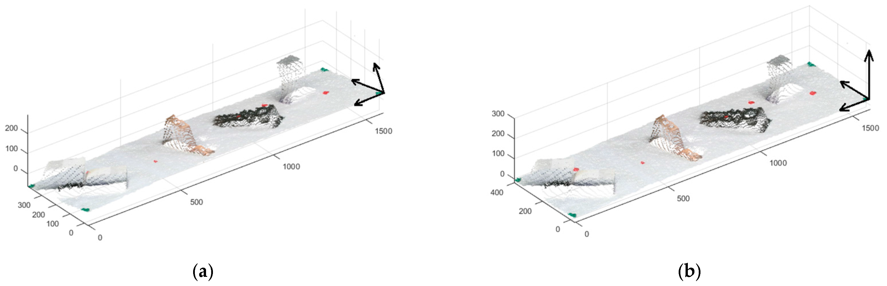 The black arrows represent the point clouds axis on the origin. (a) Point cloud on the Kinect coordinate frame; (b) point cloud on the robot coordinate frame.