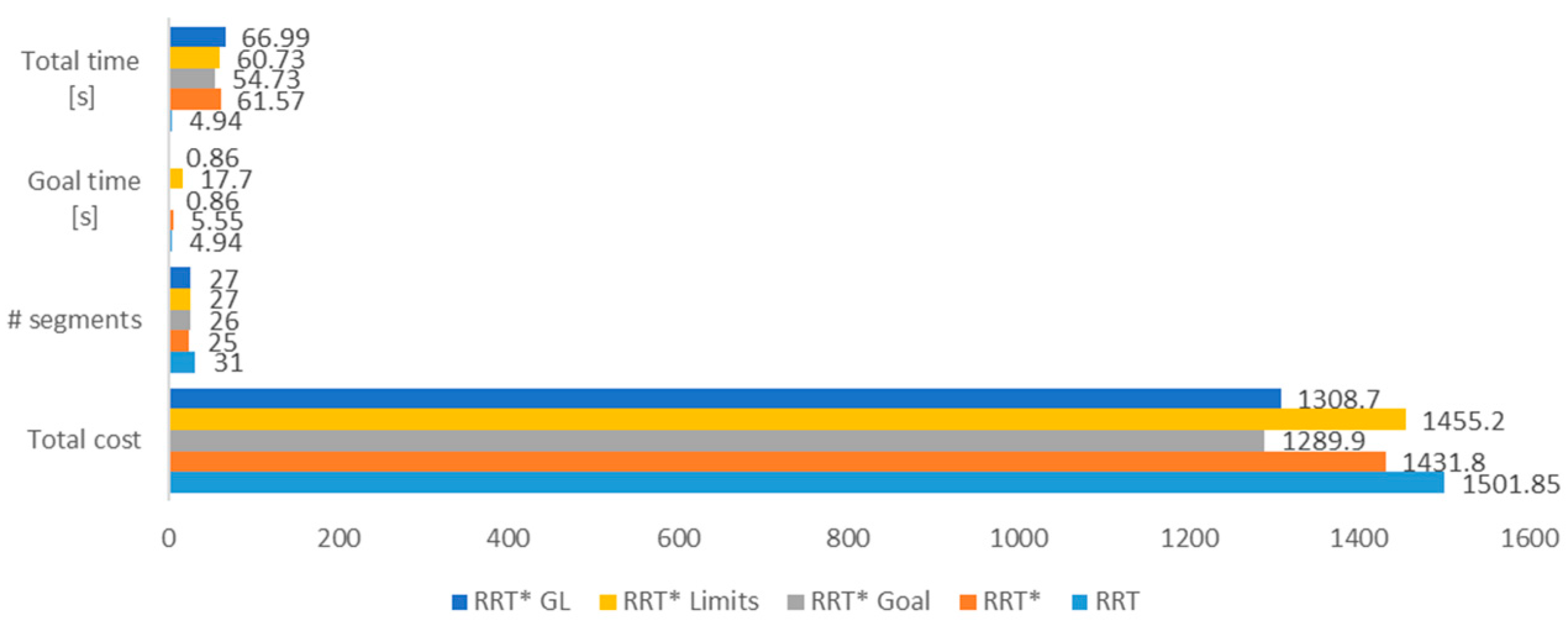 The number of segments of the path in the RRT* is the lowest in most of the cases, which means that in order to achieve a more optimal path, the algorithms need more segments to reduce the path cost.