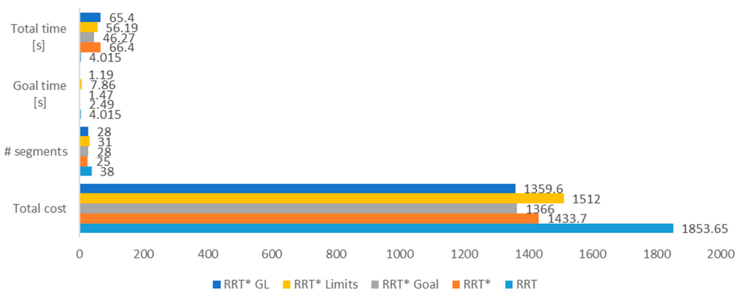 Each algorithm was tested ten times to obtain the mean cost, number of segments in the resulting path, the time for locating the target point and the execution time of the algorithm through all of the iterations.