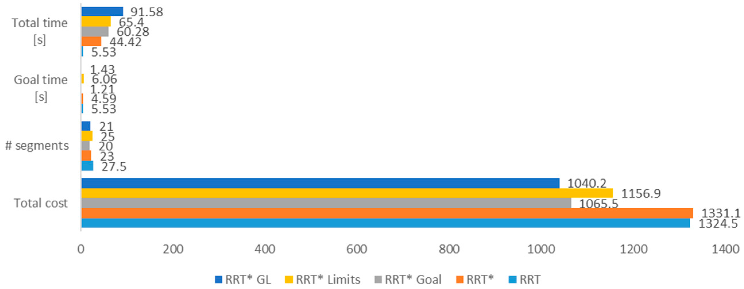 As we can see in the results tables, the RRT* Goal algorithm significantly decreases the time of finding a feasible solution (Goal time), providing more time and computational resources to the path optimization. The RRT* Limits algorithm increases the density of the tree branches around the path, as seen in Figure 14d, which results in lower path costs with respect to the standard RRT*. The combination of both methods shows a significant improvement in the performance of the path planning algorithm, producing a more optimal path without increasing the number of iterations. However, this method requires more time and therefore more computational resources to run. This disadvantage can be balanced by decreasing the number of iterations to obtain similar path costs in less time.