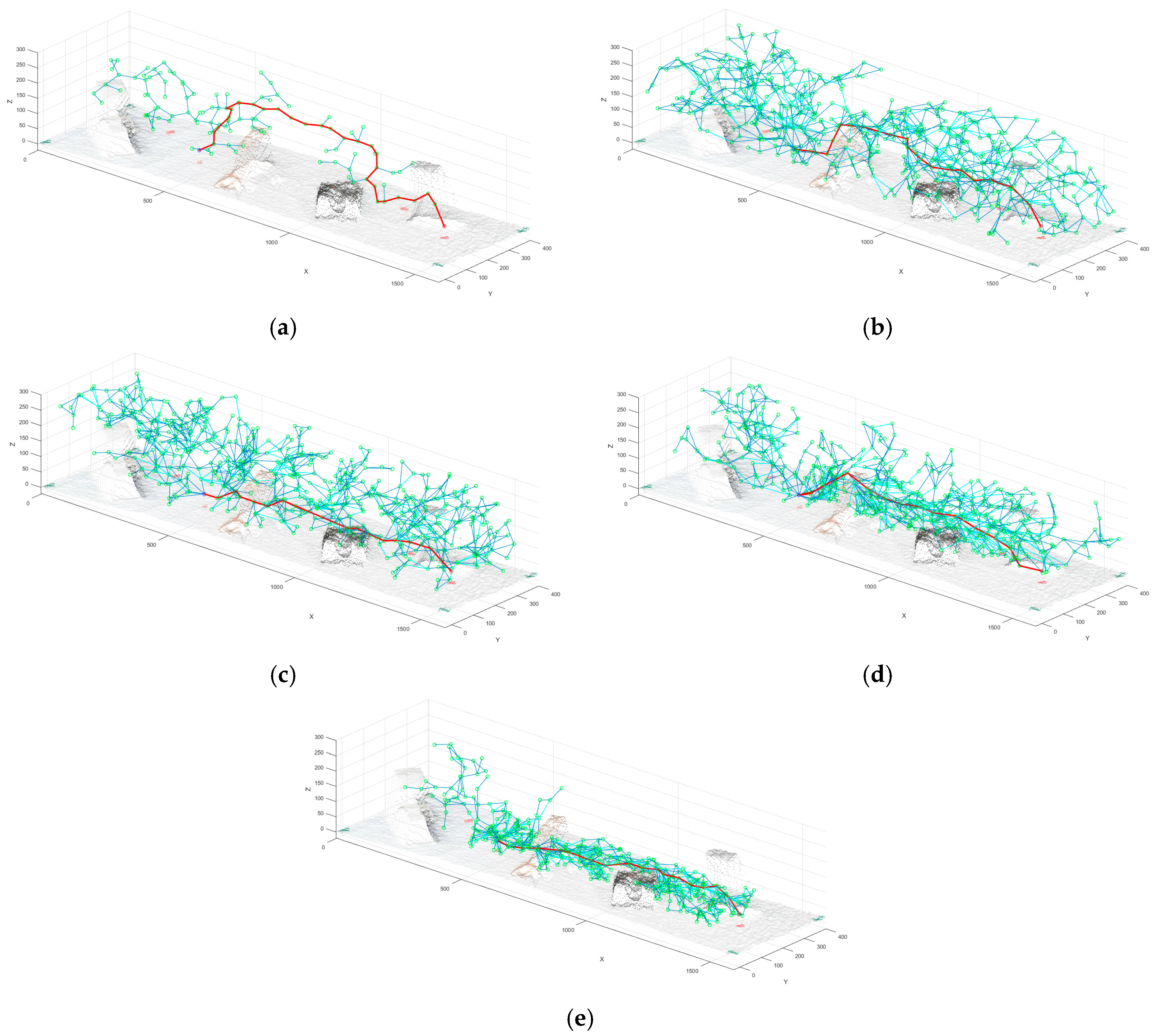 Comparison between RRT* algorithms in a simulation example (600 iterations) in a workspace with three obstacles between the start and goal point. The edges of the tree are presented in blue. The best path that reaches the goal is highlighted in red. (a) The RRT standard; (b) the RRT*; (c) the RRT* Goal; (d) the RRT* Limits and (e) the RRT* GL.