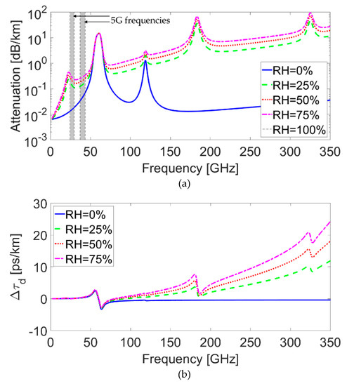 The transmission characteristics of the atmosphere are shown in Figure 1. In this example, graphs are drawn for several values of relative humidity (RH = 0%, 25%, 50%, 75%, and 100%) at sea level, assuming clear skies and no fog or rain. The attenuation factor, in dB/km, is drawn in Figure 1a, revealing absorption peaks at 22 and 183 GHz, where the resonance absorption of water (H2O) occurs; as well as absorption peaks at 60 and 119 GHz, due to the absorption resonances of oxygen (O2) [,,]. A minimum attenuation is obtained at atmospheric transmission “windows” in the Ka- (35 GHz) and W-bands (94 GHz), as well in the vicinity of 130 and 220 GHz []. The gray bands represent the spectrum allocated for the 5G. In Figure 1b, we show the incremental group delay (in ps/km) caused by the phase variation in the frequency. The atmospheric transfer characteristics can be calculated for any value of the relative humidity (RH).