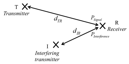where is the receiver antennas gain, is the wavelength of the transmitted signal (c is the speed of light, f is the frequency), and are the distances between the transmitter or interferer to the receiver, respectively, and is the power attenuation factor caused by the atmospheric medium. The signal to interference power ratio at the receiver site is given by the following: