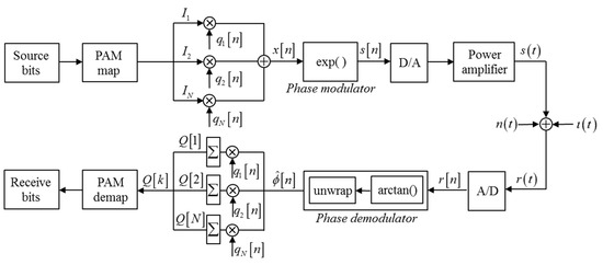 The signal arriving at the receiver from the transmitter is a constant envelope phase-modulated waveform. Its complex amplitude at baseband is given by the following []: