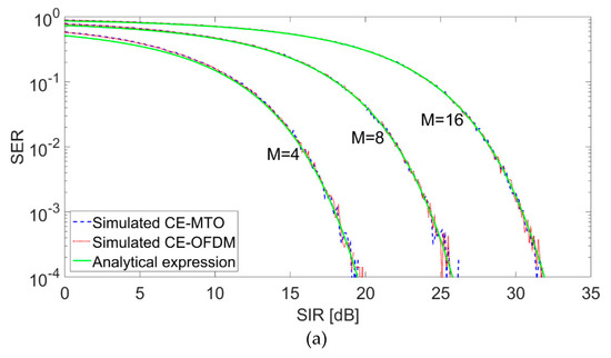 A comparison is made between the analytical results obtained using Equation (15) and those obtained from simulations of the CE-MTO and the CE-OFDM demodulation in the presence of external interference. Figure 4 shows the graphs of the SER as a function of the SIR. The correlations between the graphs are revealed. The graphs were drawn assuming chips for each of the N = 14 orthogonal waveforms. Several PAM constellation orders, M = 4, 8, and 16, wre considered. In order to keep the bandwidth restrained, the modulation index is set to .