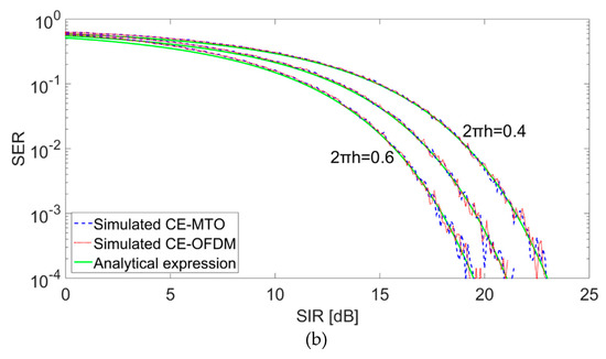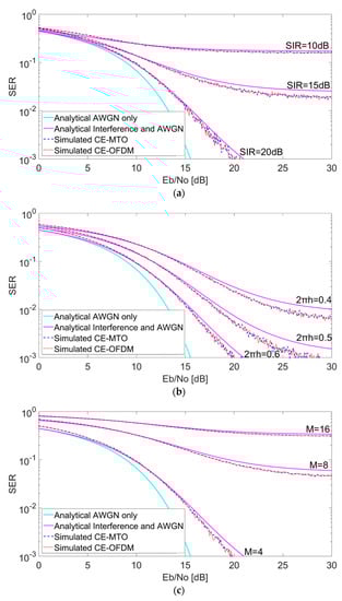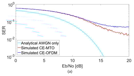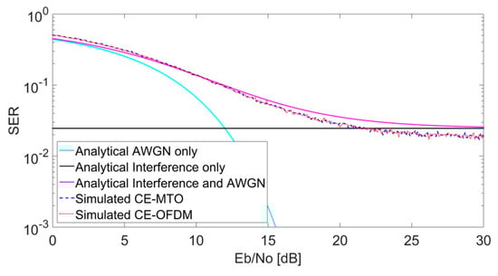 A comparison is made between the analytical results obtained using Equation (18) and the simulation results of the CE-MTO and the CE-OFDM techniques in the presence of external interference and AWGN. Figure 5 shows the simulated results for the SER as a function of the . It is noticeable that there is a high correlation between the simulated results for both modulation techniques (CE-OFDM and CE-MTO).