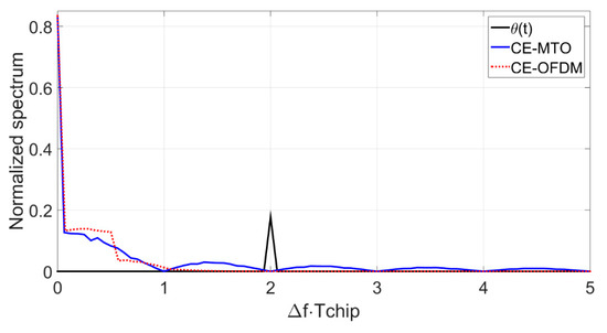 Interferer shift in frequency results in phase , where is the difference in carrier frequencies. Figure 7 presents the spectrum of the CE-OFDM, CE-MTO, and the CW interference. Note that for the CE-MTO, is the time duration of a series “chip”, while for the CE-OFDM, , where N is the number of subcarriers. The inspection of Figure 7 reveals that the CE-MTO spectrum is null for the = integer. The interference is located at . Comparing the two modulation techniques reveals a slight difference between the spectrum of the CE-OFDM and that of the CE-MTO.