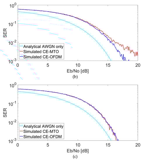 Figure 8a–c shows the graphs of the SER as a function of . The results in Figure 8a–c have been obtained for orthogonal waveforms of chips. The order constellation is M = 4 and the modulation index is . It is assumed that the signal to interference power ratio is SIR = 15 dB for different frequency shift values, . In Figure 8a, where , the performance of CE-MTO is revealed to be better than that of CE-OFDM. However, in Figure 8b, where , the CE-OFDM demonstrates a better performance than that of CE-MTO. The curves in Figure 8c refer to . In this scenario, the performance of CE-MTO and that of CE-OFDM are identical. The results obtained in Figure 8a–c are as expected when examining the spectrum as given in Figure 7.