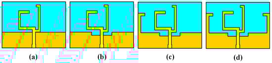 The proposed antenna element contains a split ring monopole and a central slotted ground with two inverted L-shape strips, which evolved from a simple split ring monopole antenna; evolution of the design process is depicted in Figure 1. The single antenna is designed on the substrate of Teflon with loss tangent 0.02 and relative permittivity 2.65. The deep yellow areas in Figure 1 denote the ground printed on the back of the substrate, while pale yellow areas indicate the split ring monopole printed on the top of the substrate. A brief description of the stepwise modification is as follows: (1) The original simple monopole antenna denoted by reference antenna A is shown in Figure 1a; (2) a slot is etched in the middle of the ground, namely reference antenna B; (3) an inversed L-shape strip is loaded on the left side of the ground on the basis of reference antenna B, which is represented by reference antenna C; (4) the proposed single-element antenna is obtained by loading an inversed L-shape strip on the right side of the ground on the basis of reference antenna C. The proposed single-element antenna is simulated and optimized by using electromagnetism simulation software, and the optimized value of the geometric parameters for the single-element antenna illustrated in Figure 3 are listed in Table 1.