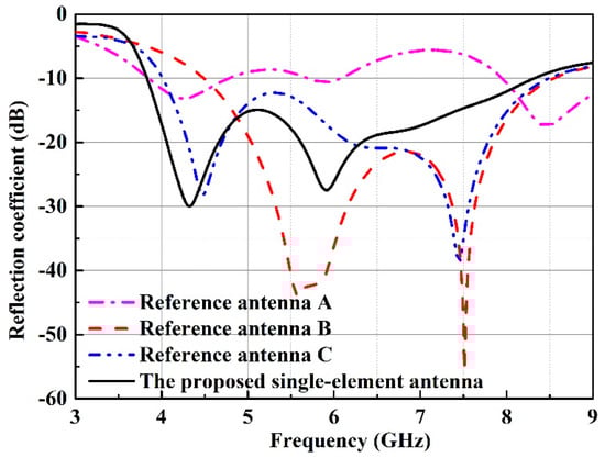 Simulated reflection coefficients of reference antenna A, B, C and the proposed single-element antenna.