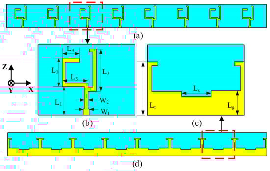 (a) Front view of the eight-element MIMO antenna; (b) front view of the single-element antenna; (c) bottom view of the single-element antenna; (d) bottom view of the proposed eight-element MIMO antenna.