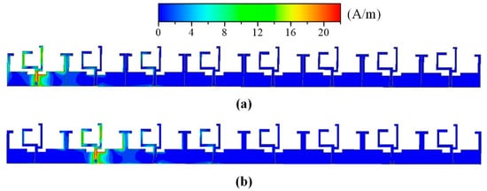 Simulation current distribution at 4.5 GHz: (a) Port 1 is excited; (b) port 2 is excited.