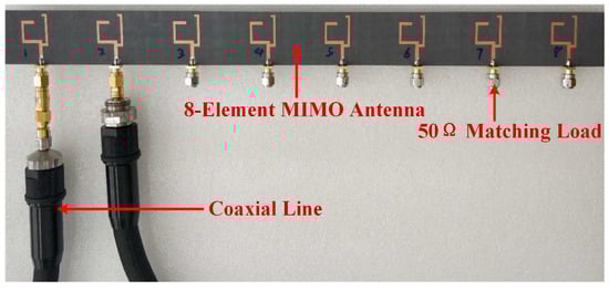 A photograph of the manufactured eight-element MIMO antenna.