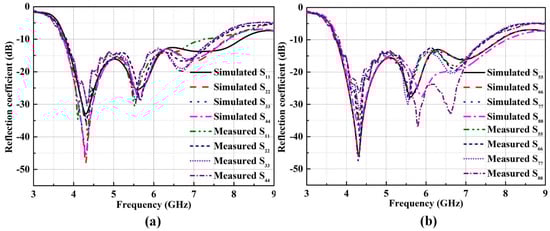 The simulation and test reflection coefficients of the eight-element MIMO antenna. (a) Simulated and measured S11, S22, S33, S44; (b) simulated and measured S55, S66, S77, S88.