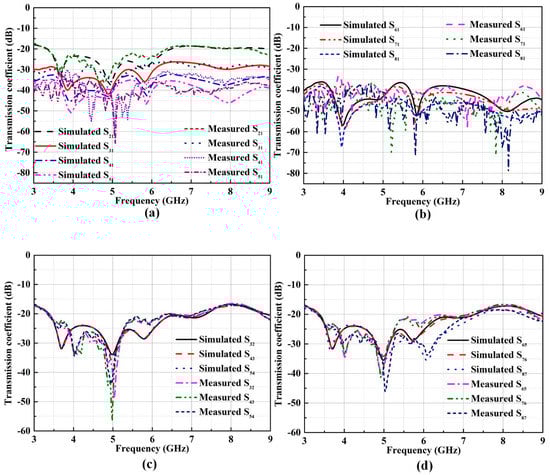The simulation and test transmission coefficients of the proposed eight-element MIMO antenna. (a) Simulated and measured results of S21, S31, S41, S51; (b) simulated and measured results of S61, S71, S81; (c) simulated and measured results of S32, S43, S54; (d) simulated and measured results of S65, S76, S87.