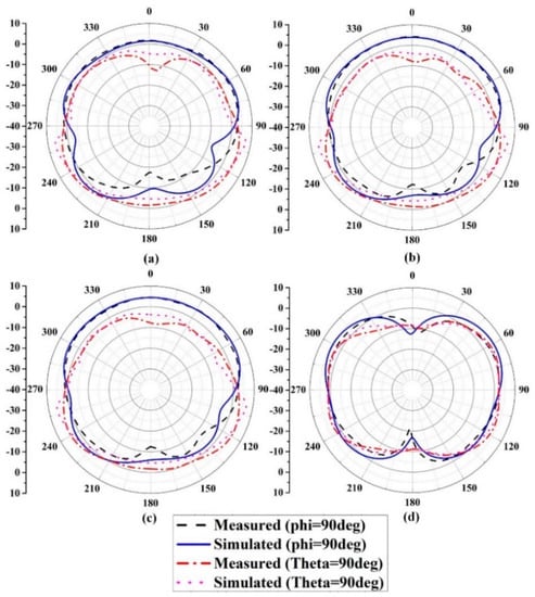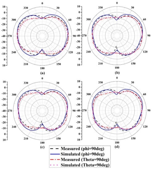 The simulation and test radiation patterns in the yoz plane (phi=90degree) and xoy plane (theta=90degree) at 4.3 GHz of the proposed eight-element MIMO excited separately by various antennas. (a) Ant 1; (b) Ant 2; (c) Ant 3; (d) Ant 4.