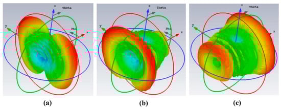 The simulated 3D radiation beams of the array at different scanning angles. (a) 0 degree; (2) 30 degree; (c) 60 degree.