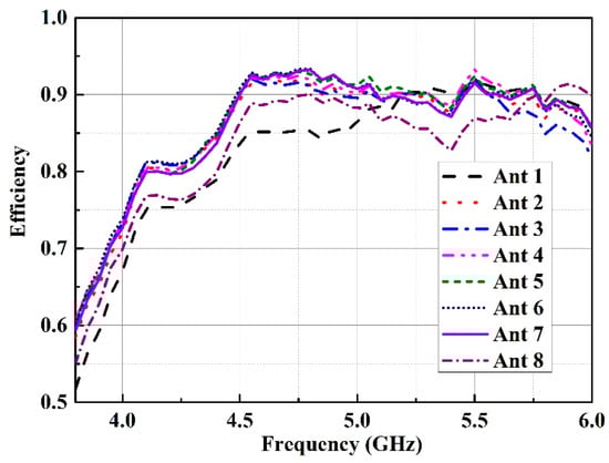 As limitations of the test conditions of anechoic chamber and wide application of the spectrum in sub-6 GHz band of 5G communications, the measured efficiency of the eight antennas below 6 GHz are presented in Figure 11. As shown in Figure 11, the measured efficiencies of Ant 1–Ant 8 are 52%–93% over the operating band.