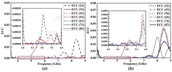 Envelope correlation coefficient (ECC), as an important index, is calculated to evaluate the diversity performance of the MIMO antenna. Here, typical ECC between element 1 and other elements and ECC between the rest of the adjacent elements are calculated using the equation in []. As shown in Figure 12, the results of ECC for any two elements are lower than 0.05 across the working band, which can meet the specific criterion of value (<0.5) for MIMO applications.