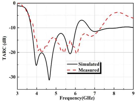 The TARC value of <0 dB is desirable for a MIMO system []. The simulated and measured TARC curves in decibels are displayed in Figure 13. The measured results indicate that the value of TARC for the proposed antenna is less than −10 dB within the band of 3.83–7.25 GHz.