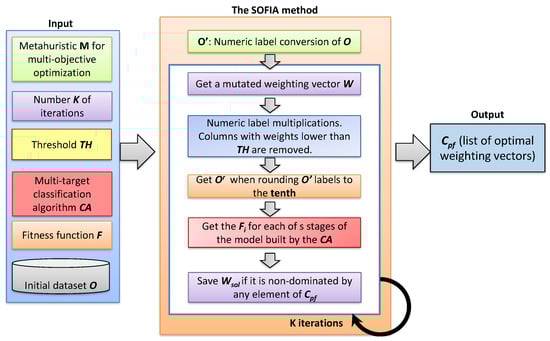 In the aforementioned SMURF methodology [], a data transformation that improves the accuracy percentages in multi-target prediction models is presented. This transformation consist of the multiplication between a feature weighting vector and the numeric labels of the columns in a clinical dataset. In addition, that transformation considers a rounding operation in order to induce alterations that help to select those features that are relevant to the class attributes (the features to be predicted) in the dataset. However, that technique, called “SAR encoding”, is based on the use of the single-objective version of the SA metaheuristic called NO [], and a rounding operation in order to find the optimal data transformation, those that achieves the best average of all accuracies in multi-target prediction models. In this sense, SOFIA can benefit from the use of multi-objective metaheuristics to improve all prediction accuracies at the same time instead of optimizing only the average accuracy in multi-target prediction models.
