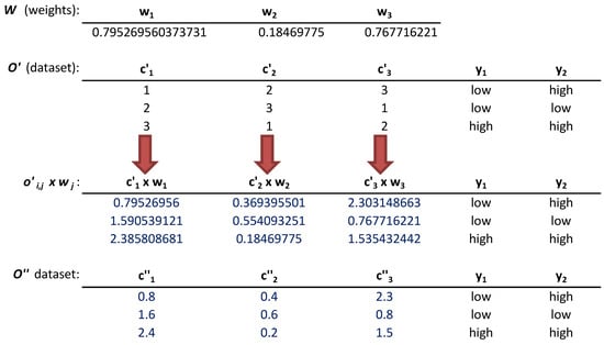 - The numeric labels of every cell were multiplied by the corresponding weight through the operation, , and , . This multiplication is illustrated in Figure 2.