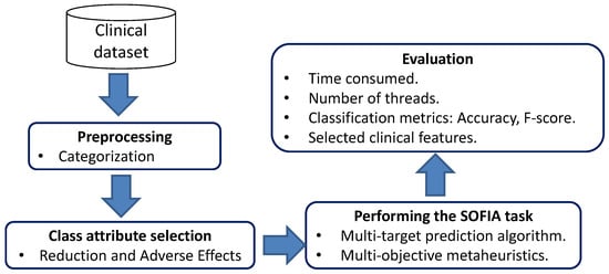The issues involved in the use of the SOFIA method when improving the multi-target prediction models for the BoNT-A treatment will be described in this section. Figure 3 presents the experiment workflow on which this experiment was based. Firstly, a database was loaded with the medical records from the two participating hospitals. Secondly, the class attribute was defined by considering the retrospective data available. Thirdly, clinical features were categorized in order to work with homogeneous data. After that, some parallel multi-objective metaheuristics are employed to perform the SOFIA method. In addition, a multi-target classification algorithm like predictive clustering trees (PCT) is applied for training multi-target prediction models.
