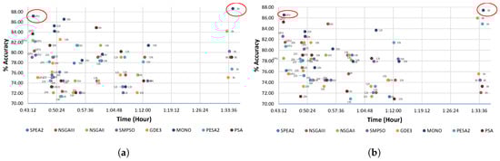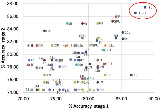 Given that it is difficult for us to visualize which method maximizes the accuracy (i.e., minimize the error) for both stages simultaneously, Figure 5 is presented considering only multi-objetcive optimization metaheuristics. In Figure 4a,b, MONO achieved a high accuracy and a low computational cost in every stage when running on the GPU. However, the best accuracy percentage is achieved when performing MONO on eight threads for every stage. In fact, in Figure 5, the best tradeoff was achieved with MONO when performing on eight threads (marked with a red circle), achieving 88.32% and 87.42% accuracy for the first and second stages respectively.